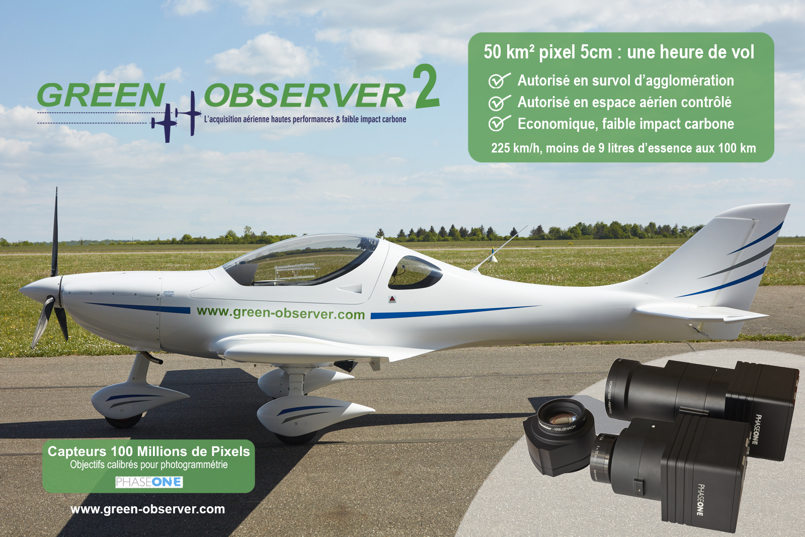 1.000 heures de vol, soit près de 180.000 km parcourus, l'équivalent de 4 tours du monde ! En deux années et demi d'exploitation Green Observer 1 n'a pas démérité : tous les chiffres de performances que nous attendions de ce nouvel appareil (vitesse, consommation, etc.) se sont vérifiés assortis d'une disponibilité opérationnelle de 100% : pas un seul « No Go » technique qui nous aurait contraints à différer ou à annuler un vol. Mais au-delà de ses performances de vol et de sa fiabilité, c'est son adéquation aux contraintes de la prise de vue aérienne qui a dépassé tous nos objectifs et enthousiasmé nombre de nos clients : grande rapidité de travail, coût au km² photographié parmi les plus bas du marché, possibilité de réaliser lors de la même mission des vues verticales destinées à la réalisation d'orthophoto pour le service SIG et des vues obliques destinées au service communication, définition et précision géométrique irréprochable des orthophotos livrées. Le tout effectué avec une signature sonore très faible, et un impact carbone jusqu'à 10 fois moindre comparé aux appareils habituels.